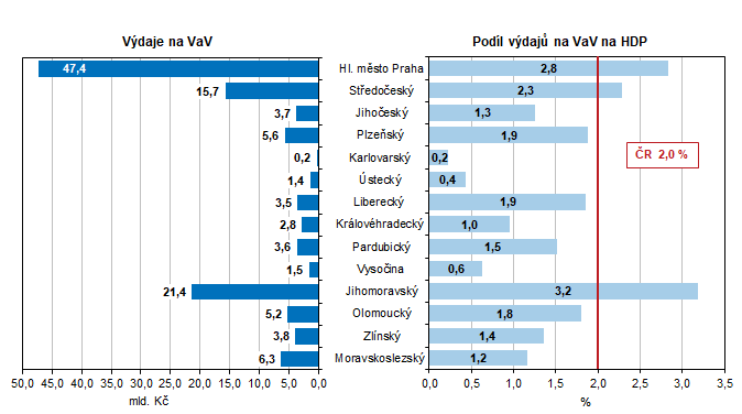 - celkové výdaje na výzkum a vývoj jsou třetí nejnižší v mezikrajském srovnání (před Ústeckým a Karlovarským krajem), stejné pořadí zaujímá kraj i v podílu výdajů na VaV na regionálním HDP