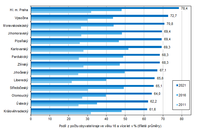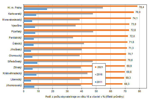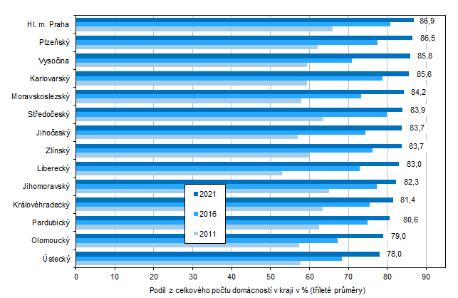 Přestože se podíl domácností vybavených počítačem už v posledních letech nijak výrazně nemění (v roce 2021 představoval 79,5 %), podíl domácností s připojením na internet se stále zvyšuje. V roce 2021 dosáhl v republikovém průměru 83,4 %, nejvíce v Praze (86,9 %), nejméně v Ústeckém kraji (78,0 %).