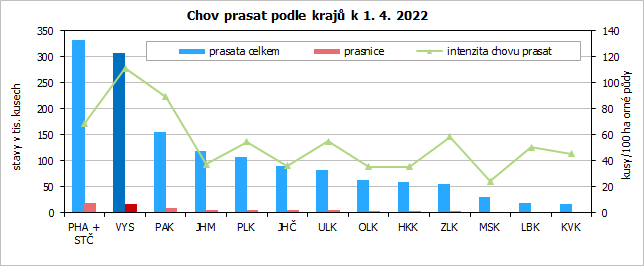 - nejvyšší intenzitu chovu prasat (111,1 ks na 100 ha obhospodařované orné půdy v r. 2022)