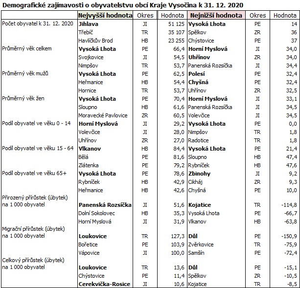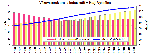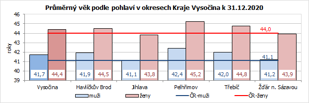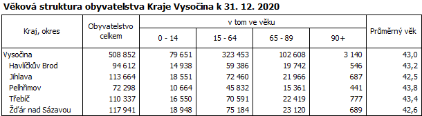Průměrný věk obyvatel na území kraje dosáhl hodnoty 43,0 roku, což je o 7,3 roku více než v roce 1991. Delší průměrný věk je patrný u žen, kde představuje 44,4 roku, u mužů je vypočten na 41,7 roku. Obyvatelé obcí Horní Myslová (okres Jihlava) a Uhřínov (okres Žďár nad Sázavou) mají průměrný věk 34,0 roku. Protipólem je již zmíněná obec Vysoká Lhota s téměř dvojnásobným průměrným věkem (66,4).