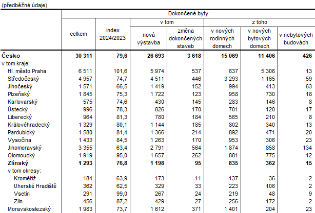 Ve Zlínském kraji se v roce 2024 dokončila výstavba 1 293 bytů, které představovaly 4,3 % celorepublikového počtu dokončených bytů. Z krajů Česka se nejvíce bytových jednotek (6 511) dostavělo v Praze, ve které, jako v jediném regionu, došlo k meziročnímu navýšení (o 1,6 %). V ostatních krajích republiky proti roku 2023 poklesla dokončená výstavba, nejvýrazněji na Jižní Moravě (-36,6 %), následně v Jižních Čechách (-33,5 %), Zlínský kraj se pohyboval svým snížením v polovině žebříčku. Nejméně dostavěných bytových jednotek (575) registrovali v Karlovarském kraji. V Česku se během roku 2024 dokončilo 30 311 bytů s meziročním poklesem 20,4 %.