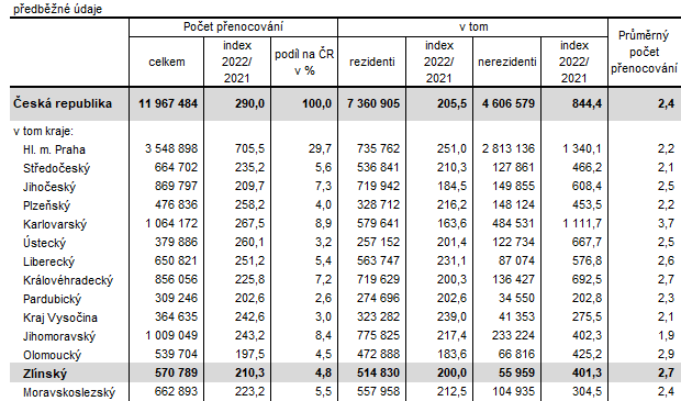 V České republice bylo ve 2. čtvrtletí tohoto roku evidováno 12,0 mil. přenocování. Z toho rezidenti zajistili 61,5 % (7,4 mil. nocí) a nerezidenti 38,5 % (4,6 mil. nocí). Nejvíce přenocování, bez rozlišení na rezidenty a nerezidenty, evidovala Praha (3,5 mil. nocí). Následovaly kraje Karlovarský (1,1 mil.) a Jihomoravský (1,0 mil. nocí). Ostatní kraje se pohybovaly v rozmezí od 309,2 tis. (Pardubický kraj) do 869,8 tis. přenocování (Jihočeský kraj). Zlínský kraj s 570,8 tis. obsadil pomyslné 9. místo.