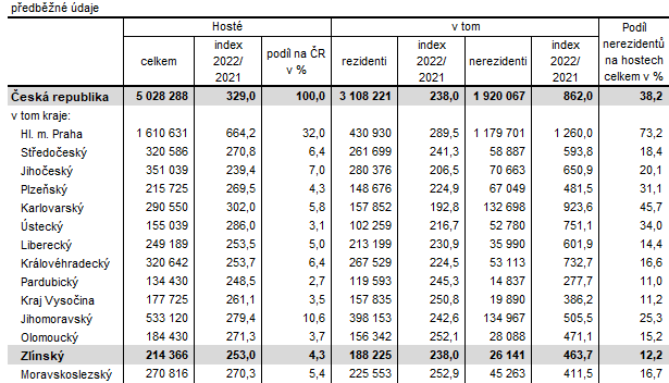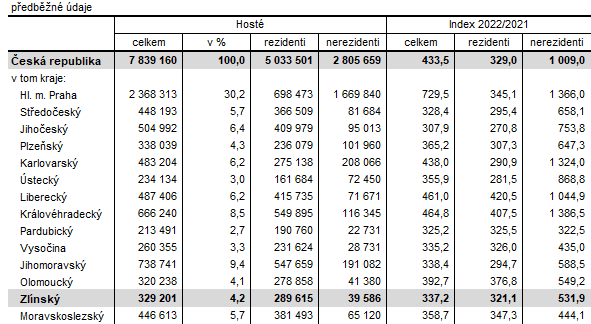 Českou republiku během prvních šesti měsíců tohoto roku navštívilo 7,8 mil. hostů, z toho 5,0 mil. rezidentů a 2,8 mil. nerezidentů. Nejvíce hostů, bez rozlišení na rezidenty a nerezidenty, navštívilo Prahu (2,4 mil.). Následoval kraj Jihomoravský (738,7 tis. hostů) a Královéhradecký (666,2 tis. hostů). Zlínský kraj s 329,2 tis. hosty obsadil 10. místo.