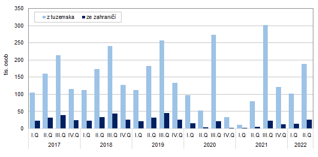 Ve 2. čtvrtletí letošního roku navštívilo Zlínský kraj a současně se na jeho území v hromadných ubytovacích zařízeních ubytovalo 214,4 tis. hostů, z toho 26,1 tis. ze zahraničí. Meziročně se počet hostů zvýšil o 129,7 tis. osob (nárůst 153,0 %). Počet přenocování vzrostl o 299,4 tis. na 570,8 tis. nocí (navýšení 110,3 %). I když meziroční indexy v roce 2022 byly silně ovlivněny různým stupněm opatření proti covidu v roce 2021, návštěvnost Zlínského kraje ve 2. čtvrtletí letošního roku dosáhla úrovně předcovidového 2. čtvrtletí roku 2019.