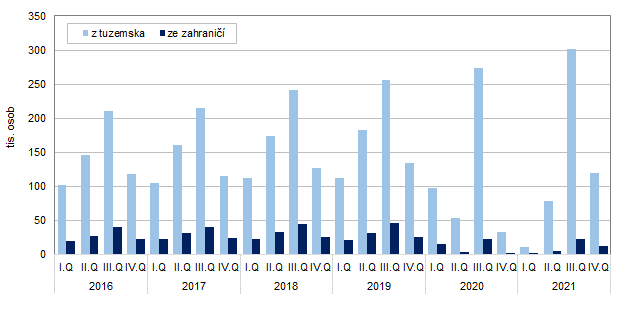 Zlínský kraj ve 4. čtvrtletí 2021 navštívilo a současně se zde v hromadných ubytovacích zařízeních ubytovalo 132,2 tis. hostů, z toho 12,3 tis. ze zahraničí. Meziročně se počet hostů zvýšil o 96,9 tis. osob, přičemž mluvíme o nárůstu 274,9 %. Počet přenocování vzrostl o 235,0 tis. na 371,8 tis. nocí, tj. jedná se o navýšení 171,7 %. Při porovnání s předcovidovým 4. čtvrtletím 2019 klesl však objem návštěvnosti Zlínského kraje na úroveň 83,2 %. Tento vývoj byl značně ovlivněn situací v předloňském roce 2020, kdy byly ubytovací služby omezeny z pandemických důvodů a cestovní ruch byl ovlivněn různým stupněm šíření covidových vln v jednotlivých zemích, včetně navazujících restrikcí v cestování.