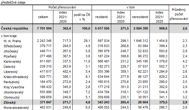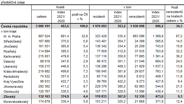 V České republice bylo ve 4. čtvrtletí 2021 evidováno 7,7 mil. přenocování. Z toho přenocování rezidentů tvořilo 65,1 % (5,0 mil. nocí) a nerezidentů 34,9 % (2,7 mil. nocí). Nejvíce přenocování, bez rozlišení na rezidenty a nerezidenty, evidovala Praha (2,2 mil. nocí). Následovaly kraje Karlovarský (911,7 tis.), Královéhradecký (620,8 tis.) a Jihomoravský (555,9 tis. nocí). Ostatní kraje se pohybovaly v rozmezí od 184,5 tis. (Pardubický kraj) do 463,0 tis. přenocování (Moravskoslezský kraj). Zlínský kraj s 371,8 tis. zaujmul pomyslné 10. místo.