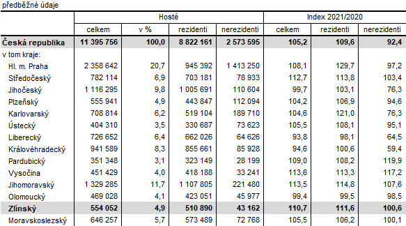 Českou republiku během minulého roku navštívilo 11,4 mil. hostů, z toho 8,8 mil. rezidentů a 2,6 mil. nerezidentů. Nejvíce hostů, bez rozlišení na rezidenty a nerezidenty, navštívilo Prahu (2,4 mil.). Následoval kraj Jihomoravský (1,3 mil. hostů) a Jihočeský (1,1 mil. hostů). Zlínský kraj s 554,1 tis. hosty obsadil 10. místo.