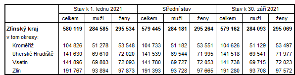Na konci září letošního roku bylo ve Zlínském kraji 579 162 obyvatel, z toho 50,9 % žen. Od počátku roku se počet obyvatel snížil o 957 osob, tedy o 0,2 %. Úbytek obyvatel byl způsoben vysokým počtem zemřelých, který převyšoval počet živě narozených o 1 083 osob. Tento úbytek přirozenou měnou jen mírně snížilo stěhování, díky kterému v kraji přibylo 126 osob.