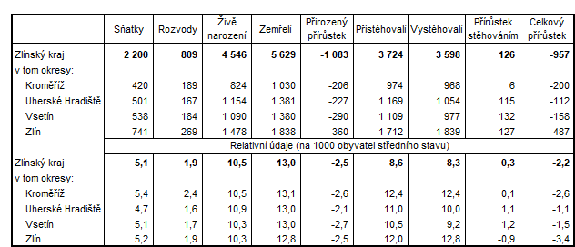 Více zemřelých než narozených a jen mírná převaha přistěhovalých nad vystěhovalými. Výsledkem je snížení počtu obyvatel Zlínského kraje o 957 na 579 162 osob. Proti stejnému období minulého roku vzrostl počet zemřelých o 13,3 %, počet živě narozených o 2,3 %. Podíl dětí narozených mimo manželství se meziročně zvýšil na 42,9 %.
