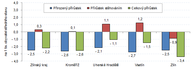 Kraj se tak zařadil mezi většinu krajů České republiky, ve kterých počet obyvatel klesl. Ke zvýšení došlo pouze v Středočeském a Jihomoravském kraji. V přepočtu na 1 tis. obyvatel se celkový přírůstek/úbytek obyvatel nacházel v intervalu od -14,3 (Karlovarský kraj) po 5,7 (Středočeský kraj). Ve Zlínském kraji se jednalo o -2,2 na tis. obyvatel, vyšší úbytek byl zjištěn v sedmi dalších krajích.