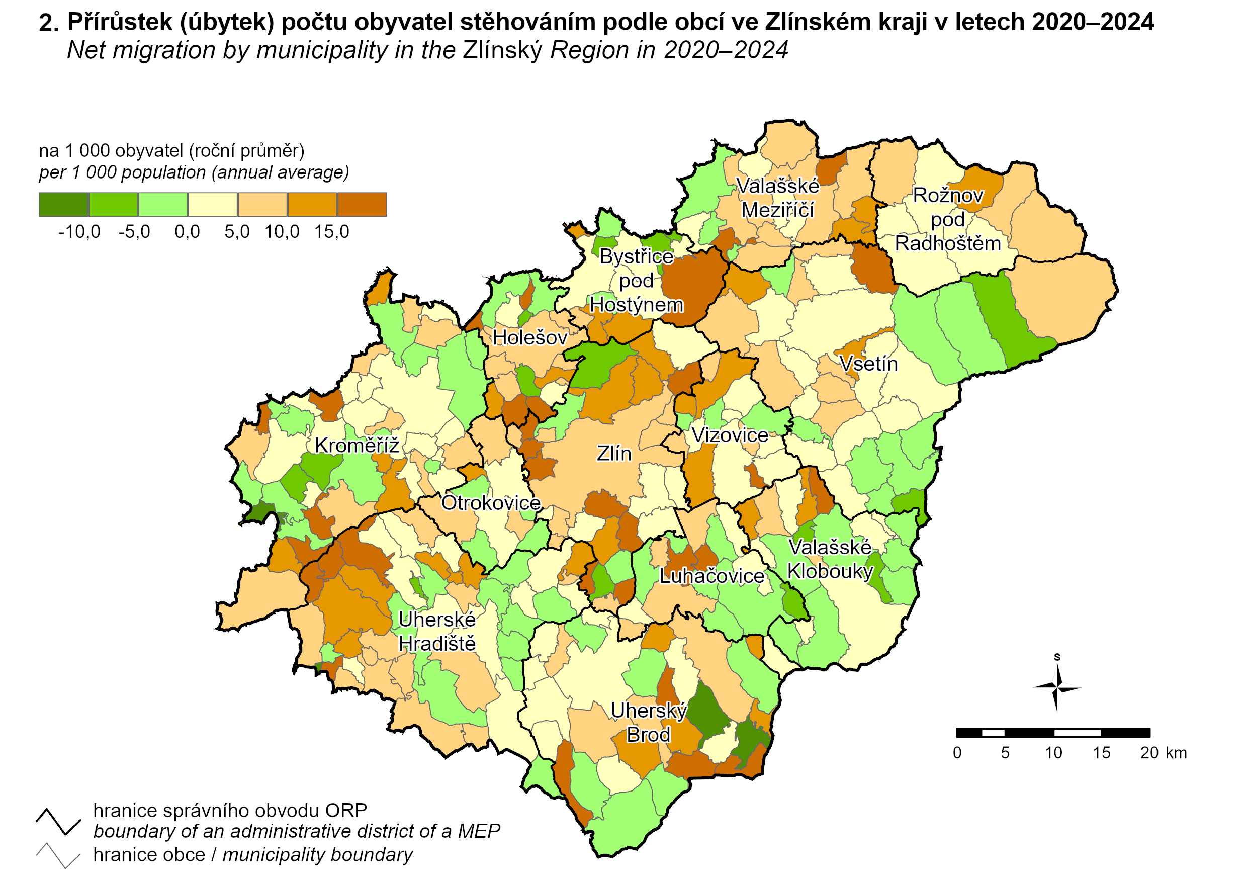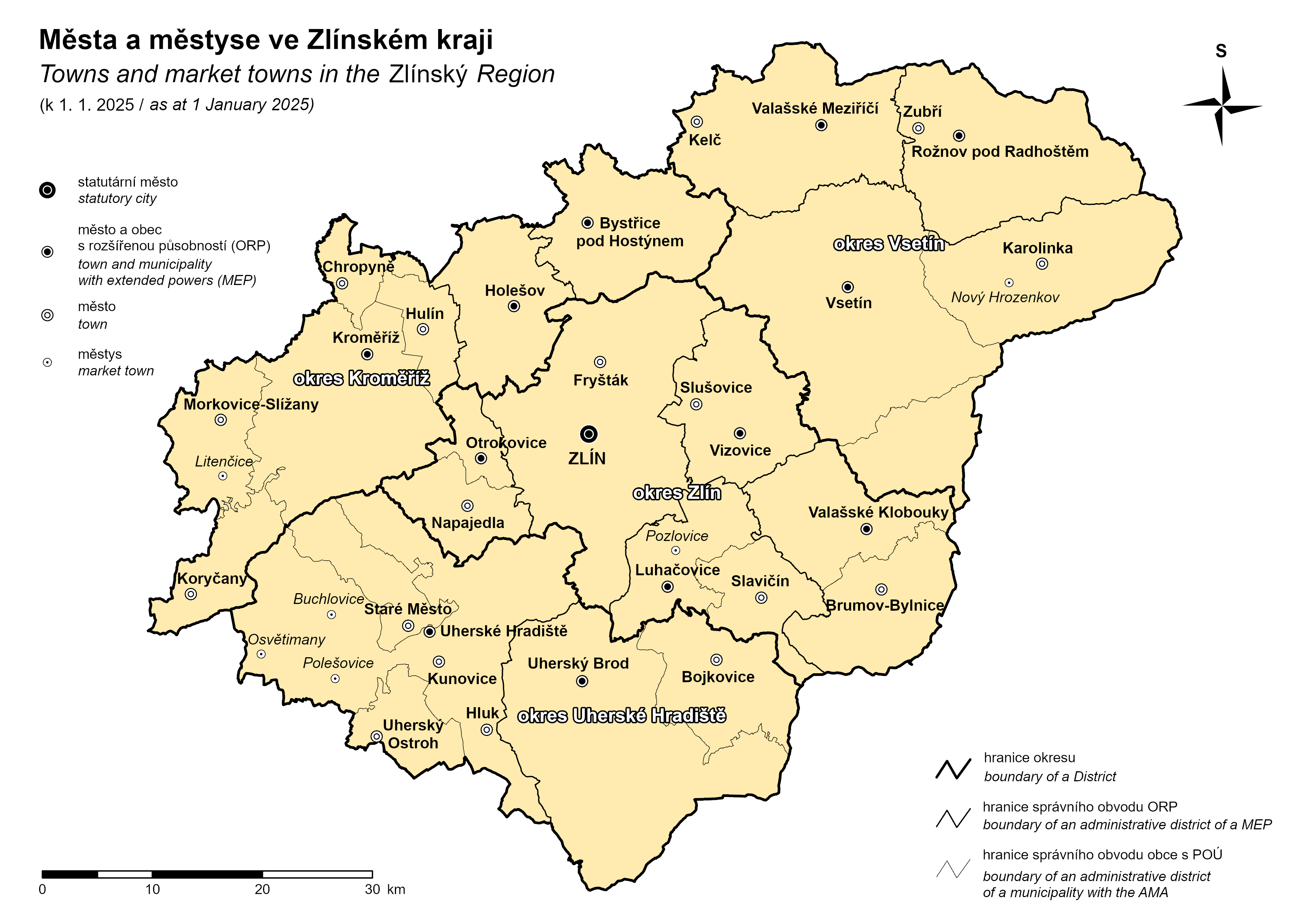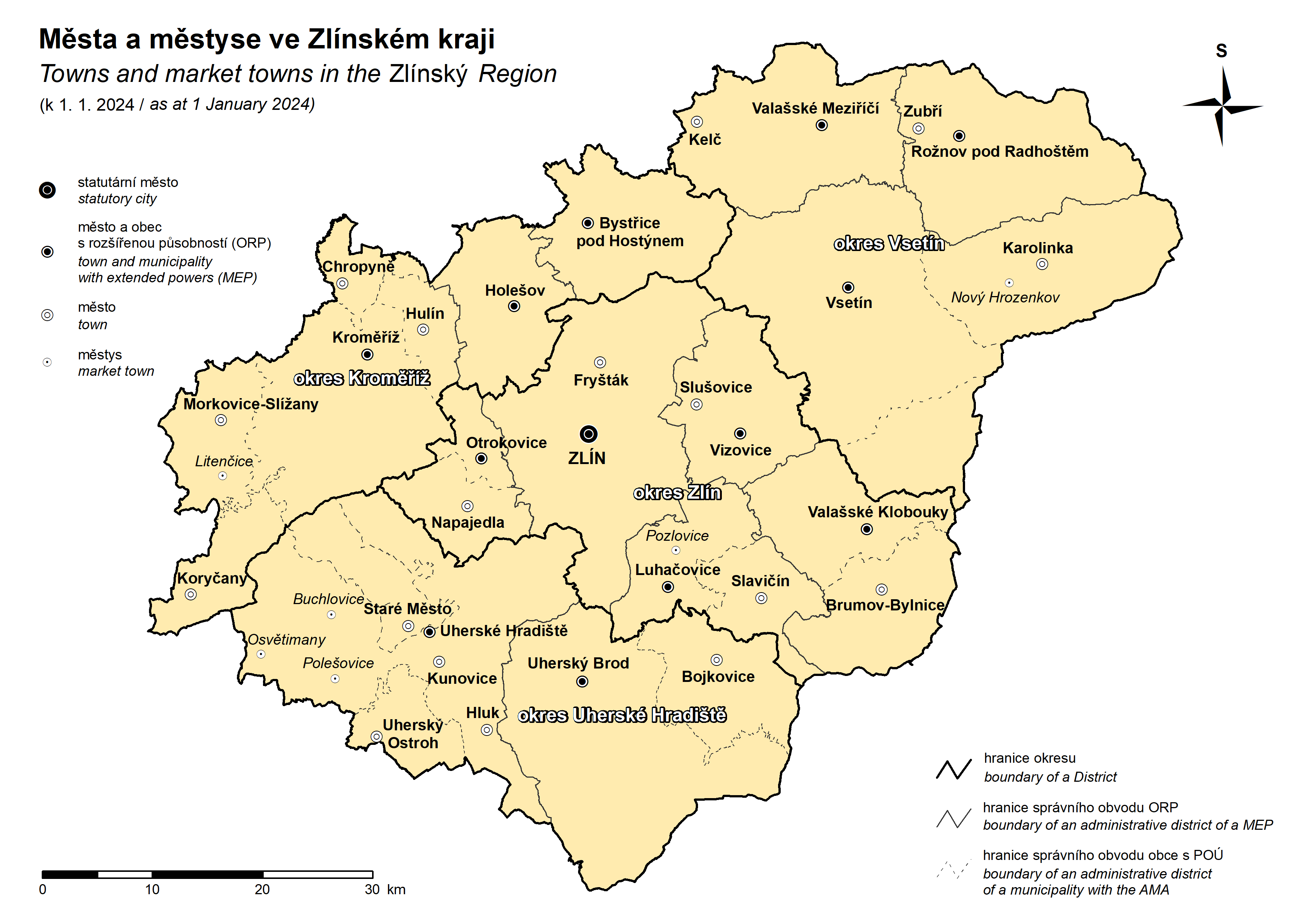 Ve Zlínském kraji se nachází 307 samosprávných obcí, které se dělí na 438 částí. Z celkového počtu obcí je 30 se statutem města a 6 statutem městyse. Ze všech měst je dle počtu obyvatel největším krajské sídlo Zlín, nejmenším obec Karolinka. Městské obyvatelstvo tvoří necelých 60 % populace kraje. Více jak polovina obcí spadá do velikostní kategorie s 200–999 obyvateli, ve kterých žije necelá pětina občanů kraje. Nejvíce osob je soustředěno do devíti největších sídel s 10 000 a více obyvateli.