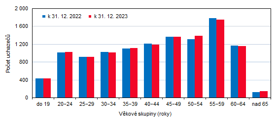 Mezi uchazeči převládali lidé ve věku 55 až 59 let (1 753 osob), kteří se na celkovém počtu uchazečů ve Zlínském kraji podíleli 15,2 %. Druhou a třetí nejpočetnější skupinu tvořily osoby ve věku 50 až 54 let (1 385 osob) a 45 až 49 let (1 362 osob). Průměrný věk uchazečů o zaměstnání činil 43,6 let, stejně jako před rokem, tedy v prosinci 2022.