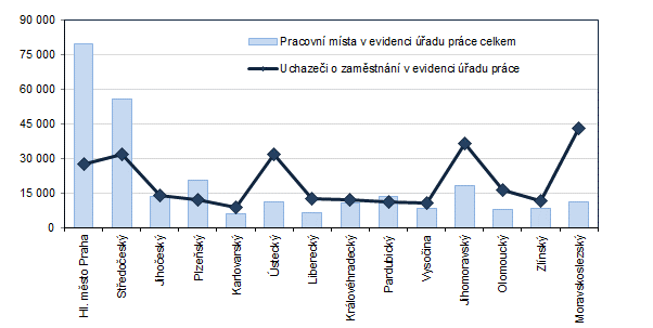 Celorepublikový průměr činil 1,03 uchazečů. V rámci České republiky evidoval nejvyšší hodnotu tohoto ukazatele Moravskoslezský kraj (3,78), naopak nejnižší Hlavní město Praha (0,34).