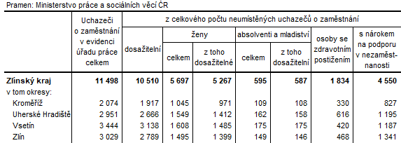 Na jedno volné pracovní místo připadalo ve Zlínském kraji 1,34 uchazečů, z toho nejvíce v okrese Kroměříž (2,32). Následovaly okresy Uherské Hradiště (1,81 uchazečů), Vsetín (1,58 uchazečů) a Zlín (0,79 uchazeče na 1 volné pracovní místo).
