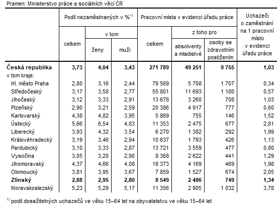 Podíl nezaměstnaných osob ve Zlínském kraji, tj. počet dosažitelných uchazečů o zaměstnání ve věku 15–64 let k obyvatelstvu stejného věku, vzrostl o 0,28 p. b. na 2,88 %. Jednalo se o druhou nejnižší hodnotu napříč všemi kraji České republiky. Nejnižší podíl nezaměstnaných zaznamenala Praha (2,80 %). Naopak nejvyšší podíly evidovaly kraje Ústecký (5,66 %) a Moravskoslezský (5,23 %), přičemž republiková úroveň činila 3,73 %.