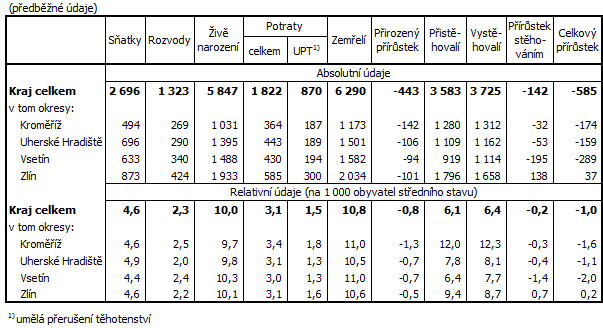 Celkový přírůstek obyvatel dosáhl za leden až prosinec ve třech okresech záporných hodnot. Meziročně se celkový úbytek obyvatel prohloubil v okrese Uherské Hradiště, a to o 19 osob. V okresech Kroměříž a Vsetín se naopak celkové úbytky zmenšily (o 50 a 62 obyvatel). Jen v okrese Zlín byl dosažen díky výraznému přírůstku stěhováním celkový přírůstek obyvatel.