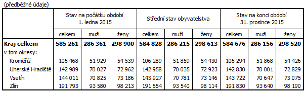 Podle předběžných výsledků měl Zlínský kraj na konci roku 2015 celkem 584 676 obyvatel. Proti stavu na konci roku 2014 ubylo v kraji celkem 585 občanů. Z okresů se pouze ve zlínském počet obyvatel o 37 zvýšil, a to pouze díky kladnému migračnímu saldu. V ostatních třech okresech v roce 2015 obyvatel ubylo. Počet obyvatel se od začátku roku snížil v okresech Vsetín o 289 osob, Kroměříž o 174 a Uherské Hradiště o 159 osob.