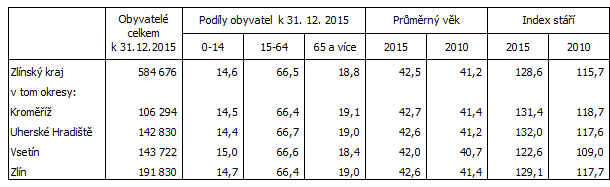Z věkových skupin se počítá ukazatel index stáří. Jde o poměr nejstarší skupiny obyvatel (ve věku 65 a více let) k nejmladší (děti ve věku do 14 let). Tento poměr nám sděluje, o kolik procent je více (nebo méně) seniorů proti dětem. Posledním rokem, ve kterém byly ve Zlínském kraji tyto dvě věkové skupiny “vyrovnané“, byl rok 2005. Index stáří v tomto roce dosáhl 99,4 %, tedy na 100 dětí v kraji žilo v 99 seniorů. V následujících letech se poměry těchto dvou věkových skupin měnily, a to tak, že se index stáří zvyšoval až v roce 2015 dosáhl 128,6 % (tedy na 100 osob ve věku 0 až 14 let připadlo 128,6 osob 65letých a starších).