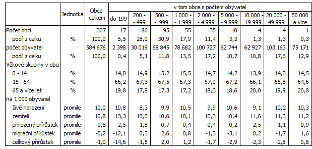 Stejně jak v průběhu let docházelo ke změnám u obyvatelů okresů a kraje, měnily se ukazatele obyvatel v jednotlivých obcích. Tři obce s největším a nejmenším počtem obyvatel, podílem věkových skupin, průměrného věku, přirozeného, migračního a celkového přírůstku obyvatel k 31. 12. 2015 je uvedeno v následující tabulce.
