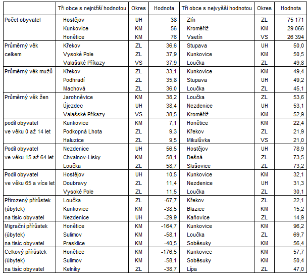 Poznámka: zkratky okresů: KM – Kroměříž, UH – Uherské Hradiště, VS - Vsetín a ZL - Zlín
