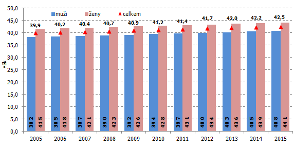 Tyto přesuny obyvatel do vyšších věkových skupin mají logicky za následek zvyšování průměrného věku obyvatel. V roce 2015 průměrný vek obyvatel Zlínského kraje dosáhl 42,5 let (u mužů 40,8, u žen 44,1 let). Proti roku 2014 se průměrný věk v kraji zvýšil o 0,2 roky (u mužů i žen také o 0,2 roky) a proti roku 2005 narostl o 2,6 let (stejné zvýšení bylo zjištěno u mužů i žen). Meziroční zvýšení průměrného věku obyvatel Zlínského kraje bylo shodné jako v případě celé republiky (i u mužů a žen). Ve srovnání hodnot průměrného věku v roce 2005 kraje a republiky již byly zaznamenané rozdíly. Zvýšení celkového průměrného věku osob ve Zlínském kraji za deset let bylo o 0,7 let vyšší než v České republice, u mužů byl v kraji nárůst od republiky vyšší o 0,6 roku a u žen o 0,8 roku.