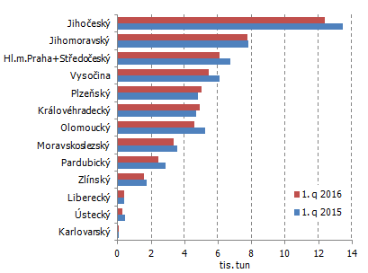Graf 1 Celková výroba masa (bez drůbežího) v ČR podle krajů od ledna do března 2016