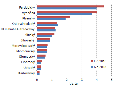 V celé České republice došlo za 3 měsíce t.r. k poklesu celkové produkce masa. Za sledované období bylo vyrobeno celkem 72,1 tis. tun masa, což je o 2,2 tis. tun méně než za první tři měsíce předchozího roku. Tedy výroba masa se v republice meziročně snížila o 3,0 %. Protože se produkce masa Hlavního města Prahy sleduje spolu se Středočeským krajem, ke snížení výroby masa došlo tedy celkem v sedmi krajích. Tedy v šesti krajích se výroba masa zvýšila. K nejvýraznějšímu propadu, a to 1,0 tis. tun masa v jatečné hmotnosti (tj. pokles o 7,2 %), došlo v Jihočeském kraji. Za ním pak následovaly kraje Hlavní město Praha spolu se Středočeským krajem (o 661 tun, tj. o 8,3 %), Olomoucký (o 632 t, tj. o 11,0 %), Vysočina (o 281 t, tj. o 2,9 %), Moravskoslezský (o 202 tun, tj. o 4,8 %), Ústecký (o 198 t, tj. o 27,1 %) a Karlovarský (o 13 t, o 7,2 %). Naopak nejvyšší nárůst výroby masa byl zaznamenán v krajích Plzeňském (o 511 tun, tj. o 7,6 %) a dále pak v krajích Královéhradeckém (121 t, o 2,0 %), Libereckém (o 90 t, tj. 14,2 %), Pardubickém ( 49 t, tj. o 0,7 %), Zlínském (o 45 t, tj. 1,7 %) a Jihomoravském (o 5 tun, tj. o 0,1 %).