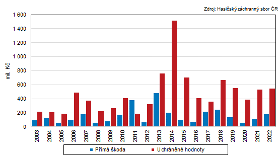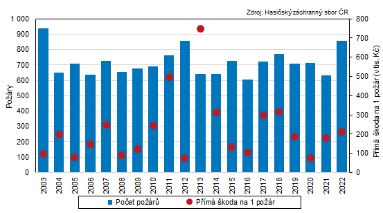 Se zvýšeným počtem požárů na území Zlínského kraje se navýšil rovněž objem přímé škody způsobené požáry. Za rok 2022 hodnota přímé škody ve Zlínském kraji dosáhla 180,7 mil. Kč. Proti roku 2021 došlo k navýšení o 67,2 mil. Kč (tj. o 59,2 %). V přepočtu na 1 požár byly přímé škody v roce 2022 ve výši 211,4 tis. Kč. Rovněž v tomto případě došlo k meziročnímu navýšení sumy o 30,9 tis. Kč (tj. o 17,1 %).