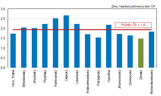 Celková částka přímé škody způsobené požáry na území České republiky dosahovala 5,76 mld. Kč a hodnota přímé škody na 1 požár byla 276,8 tis. Kč. Nejvyšší celková přímá škoda způsobená požáry i škoda na 1 požár vznikla ve Středočeském kraji (celkem 2,66 mld. Kč, 911,4 tis. Kč na 1 požár). Nejnižší přímé škody způsobené požáry vykazoval Liberecký kraj (116,2 mil. Kč), v přepočtu na 1 požár s částkou 82,7 tis. Kč potom kraj Ústecký. Zlínský kraj evidoval 7. nejvyšší částku přímé roční škody a hodnota přímé škody na 1 požár byla 4. nejvyšší mezi kraji.