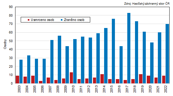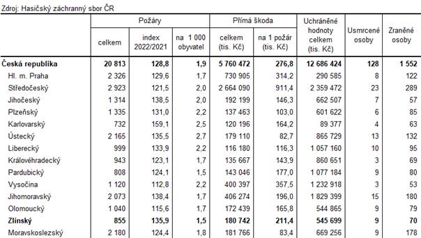 Za rok 2022 zemřelo v České republice na následky požárů celkem 128 osob a zraněno bylo celkem 1 552 osob. Nejvíce usmrcených i zraněných osob zaznamenal Středočeský kraj (23 usmrcených a 289 zraněných). Nejméně osob zahynulo v kraji Královéhradeckém a na Vysočině (shodně 3 osoby). Kraj Vysočina rovněž zaznamenal nejnižší počet zraněných s celkovým počtem 53 osob. Zlínský kraj s devíti zemřelými obsadil pátou nejvyšší příčku mezi kraji (společně s kraji Moravskoslezským, Olomouckým a Pardubickým). V počtu zraněných zaznamenal Zlínský kraj 5. nejnižší hodnotu.