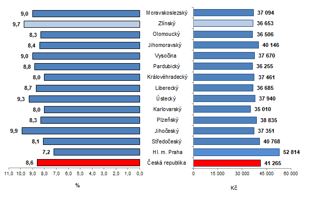 I přesto, že mzda ve Zlínském kraji vzrostla o 9,7 %, tedy o 3 234 Kč, zůstala pod celorepublikovým průměrem a v mezikrajském srovnání byla čtvrtou nejnižší. Proti krajům Karlovarskému, Pardubickému, a Olomouckému, které měly nejnižší hodnotu tohoto ukazatele (35 010 Kč, 36 255 Kč a 36 506 Kč) v rámci České republiky, byla průměrná mzda ve Zlínském kraji vyšší jen o 1 643 Kč (oproti Karlovarskému kraji), o 398 Kč (oproti Pardubickému kraji) a o 147 Kč (oproti Olomouckému kraji). Několik předcházejících čtvrtletí byla v Olomouckém kraji evidována vyšší průměrná mzda než v kraji Zlínském.
