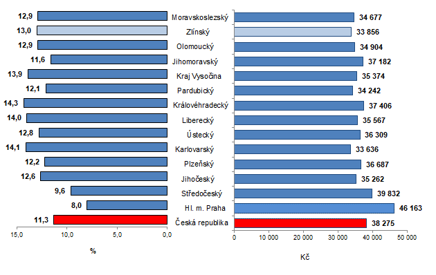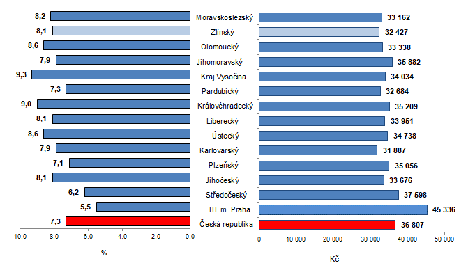 Nižší průměrná mzda byla zjištěna už jen v Karlovarském kraji (31 887 Kč), tedy o 540 Kč nižší než v kraji Zlínském. Naopak nejvyšší průměrná mzda byla v Hlavním městě Praze, a to 45 336 Kč. S odstupem 7,7 tis. Kč následoval kraj Středočeský s hodnotou 37 598 Kč. Proti těmto dvěma krajům zaostávala průměrná mzda ve Zlínském kraji o 12 909 a 5 171 Kč.