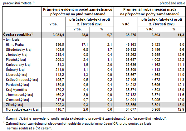 Ve 2. čtvrtletí letošního roku se začal trh práce postupně vzpamatovávat z karanténních opatření. Ve Zlínském kraji vzrostla průměrná hrubá měsíční nominální mzda na přepočtené počty zaměstnanců v národním hospodářství proti stejnému období předchozího roku o 13,0 % (3 894 Kč) na 33 856 Kč. Takový nárůst je do značné míry ovlivněn nízkou srovnávací základnou (2. čtvrtletí 2020). V mezikrajském srovnání však nadále zůstává daná mzda druhou nejnižší.