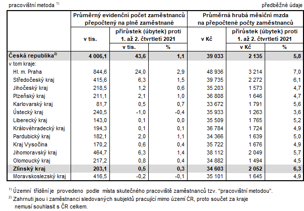 V prvním pololetí letošního roku vzrostl průměrný evidenční počet zaměstnanců (přepočtený počet) proti stejnému období roku 2021 ve dvanácti krajích České republiky. Z toho největší nárůst zaznamenala Praha (o 2,9 %). Ve Zlínském kraji vzrostl průměrný počet zaměstnanců o 0,3 %, což v absolutním vyjádření činilo 0,5 tis. osob. Evidováno tak bylo 203,1 tis. zaměstnanců a na celkovém počtu v České republice se Zlínský kraj podílel 5,1 %. Pouze u dvou krajů došlo ke snížení zaměstnanosti. Jednalo se o kraje Ústecký (pokles o 0,4 %) a Moravskoslezský (o 0,1 %). Celorepublikově byl zaznamenán nárůst o 1,1 %.