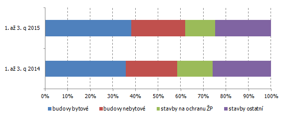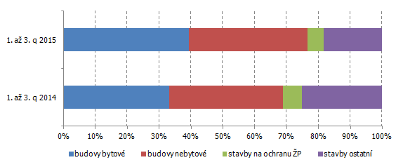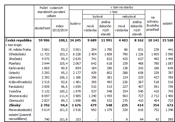 Stavební úřady na území kraje vydaly během tří čtvrtletí t.r. celkem 2 702 stavebních povolení v orientační hodnotě staveb 6 808 mil Kč. Ve srovnání se stejným obdobím předchozího roku počet stavebních povolení o 159 klesl (tj. o 5,6 %) a orientační hodnota staveb se meziročně snížila o 14,1 %. Průměrná hodnota jednoho stavebního povolení tak klesla z 2 770 tis. Kč v 1. až 3. čtvrtletí 2014 na 2 520 tis. Kč ve sledovaném období t.r. Největší podíl na celkovém počtu stavebních ohlášení a povolení měly stavby – budovy 62,0 %. Podíl staveb na ochranu životního prostředí činil 13,1 % a u ostatních staveb 24,9 %. Na celkovém počtu stavebních ohlášení a povolení na budovy převažoval podíl změn dokončených staveb nad novou výstavbou o 14,8 procentního bodu.