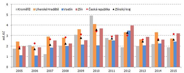 Graf 1 Průměrná hodnota jednoho stavebního povolení ve Zlínském kraji a jeho okresech