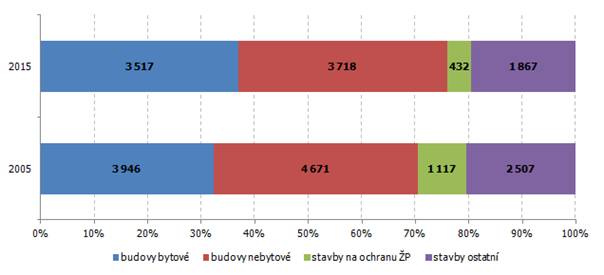 Stavební úřady na území kraje vydaly během roku 2015 celkem 3 604 stavebních povolení v orientační hodnotě staveb 9 534 mil Kč. Ve srovnání s předchozím rokem počet stavebních povolení klesl o 147 (tj. o 3,9 %) a orientační hodnota staveb se meziročně snížila o 2,9 %. Průměrná hodnota jednoho stavebního povolení vzrostla z 2 616 tis. Kč v roce 2014 na 2 645 tis. Kč ve sledovaném roce. Největší podíl na celkovém počtu stavebních ohlášení a povolení měly stavby – budovy 60,8 %. Podíl staveb na ochranu životního prostředí činil 14,2 % a u ostatních staveb 25,1 %. Na celkovém počtu stavebních povolení na budovy převažoval podíl změn dokončených staveb nad novou výstavbou o 13,7 procentního bodu.