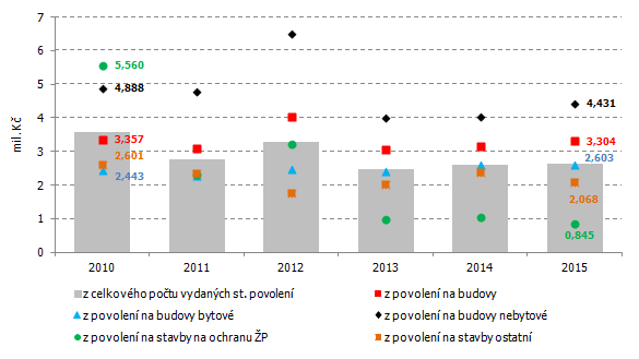 V republice se projevil také 2% meziroční nárůst orientační hodnoty staveb, ke kterým bylo vydáno stavební povolení, o 5 055 mil. Kč. Průměrná hodnota na jedno stavební povolení se zvýšila z 2 671 tis. Kč v roce 2014 na 3 167 tis. Kč.