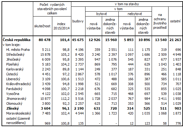 Nejmenší snížení orientační hodnoty povolených staveb bylo vypočteno ve Zlínském kraji, a to o 280 mil. Kč (o 2,9 %). Průměrná orientační hodnota na jedno stavební povolení ve Zlínském kraji se zvýšila o 29 tis. Kč na 2 645 tis. Kč a mezi kraji byla 7. nejvyšší. Nejnižší průměrná hodnota jednoho stavebního povolení v roce 2015 byla po meziročním snížení o 47 tis. Kč vypočtena ve Středočeském kraji (2 024 tis. Kč).