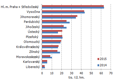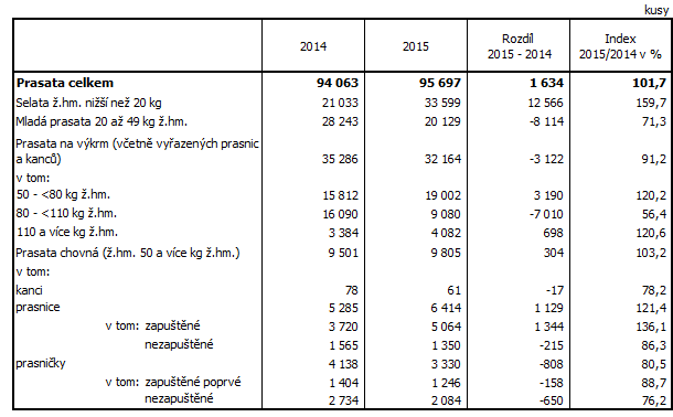 Počet prasat určených na výkrm v nejnižší váhové skupině (50 až 79 kg) se proti stavu na konci roku 2014 o pětinu zvýšil. Ve skupině od 80 do 109 kg se naopak jejich počet snížil zhruba o 40 %. U skupiny od 110 kg a více byl zaznamenán také pětinový nárůst.